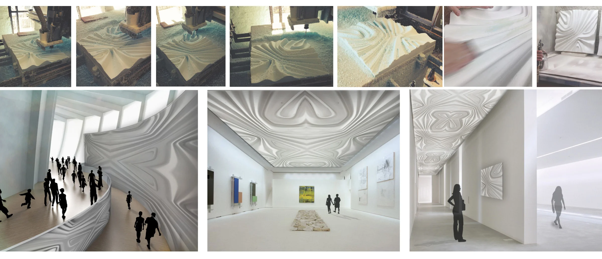 This piece was created using 3D Rhino software and CNC machinery. Below one can observe more in depth the process taken to create it. First images show the CNC machine at work, later application of plaster and carefully sanding it out, and finally applying paint. Photo montages below the process are small demonstration for potential applications.