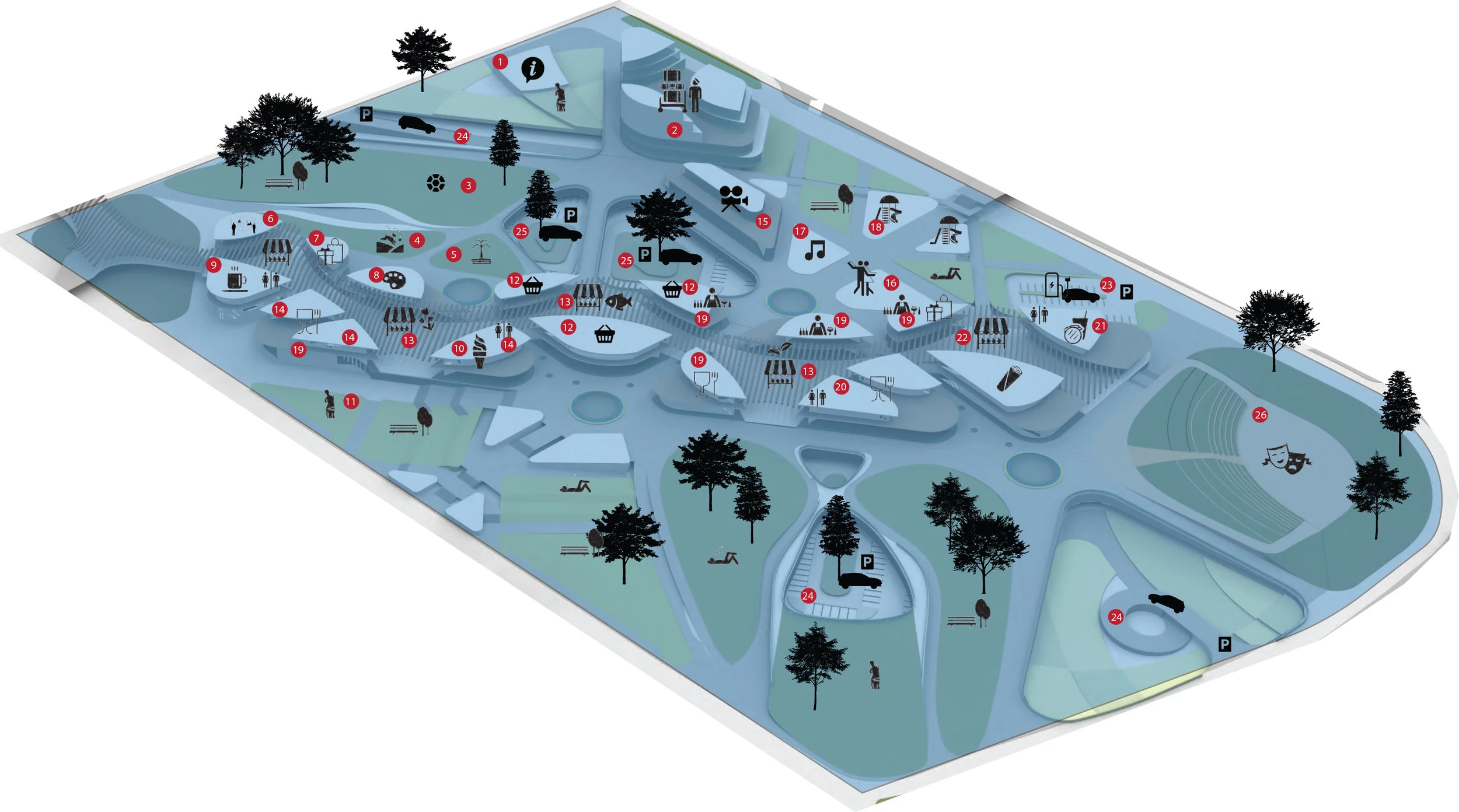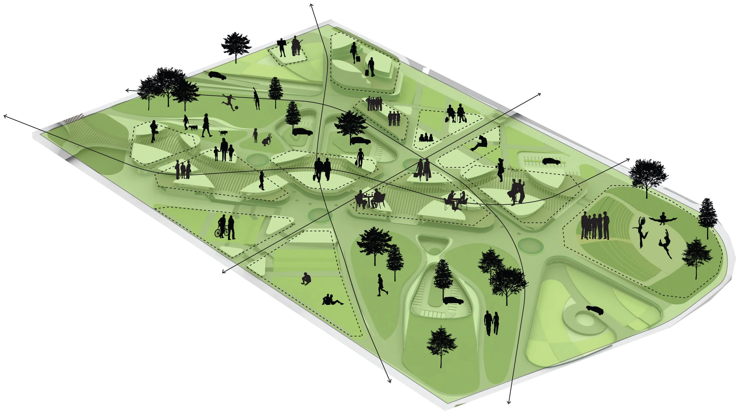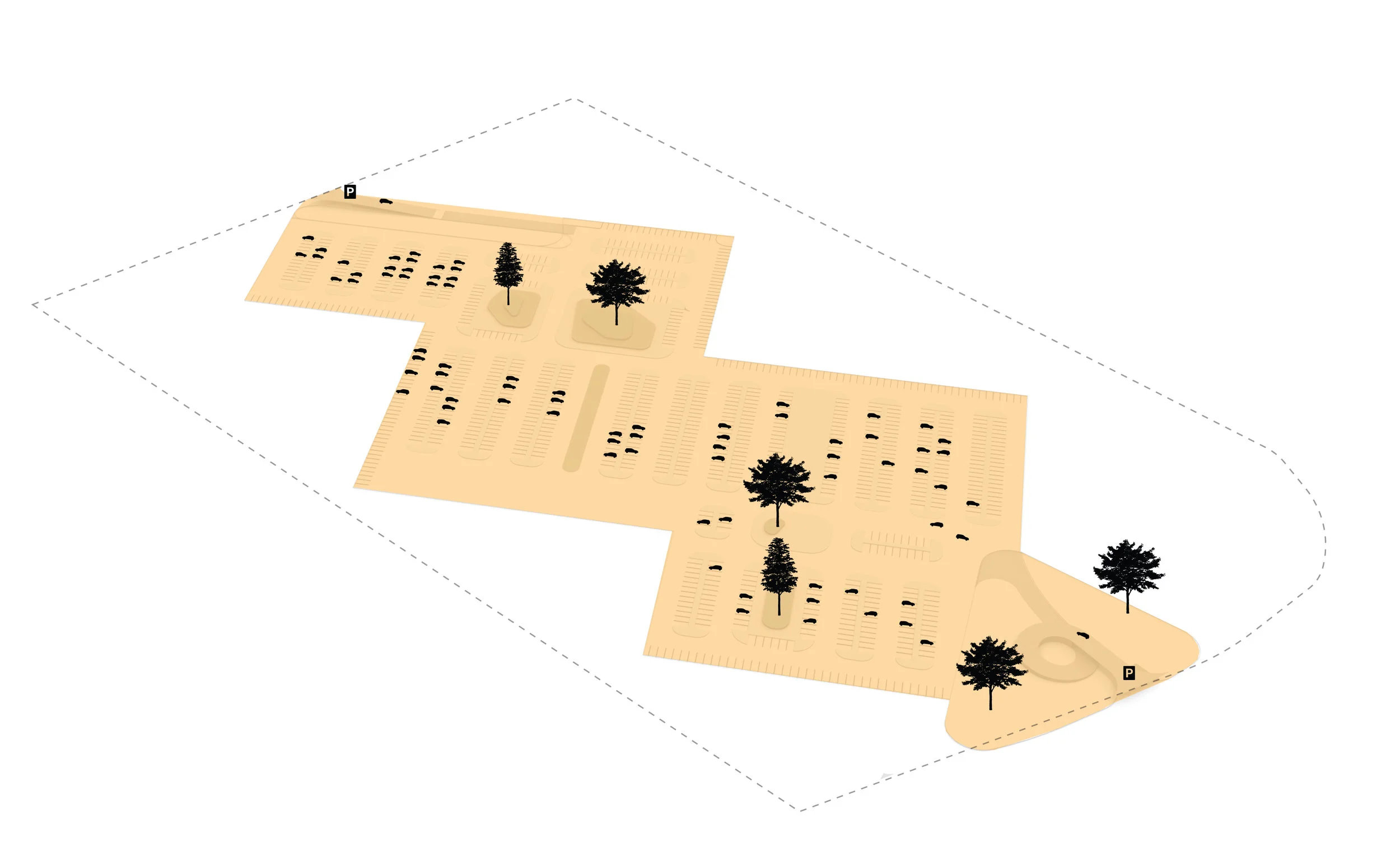 The need for parking is essential to the users vacating the dense neighboring areas. Implementing an underground experimental parking, which will replace the existing open parking lots, will let us separate the car traffic from the pedestrian only areas. These levels and spaces address circulation, program, and functionality, therefore, divergent transportation systems will be able to coexist harmoniously. Ultimately, celebrating, and integrating the use of the vehicles yet, giving precedence to the pedestrian and local community.
